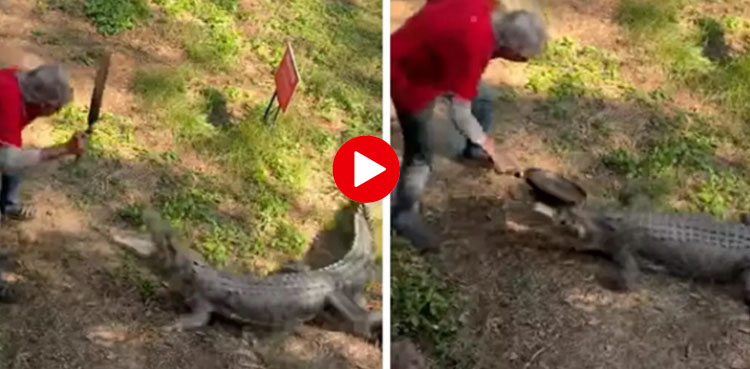 فیس بک پر وائرل ویڈیو میں دیکھا جاسکتا ہے کہ مگرمچھ معمر شخص پر حملہ آور ہوا تو انہوں نے اسے مارنے کے لیے فرائی پین اٹھالیا۔