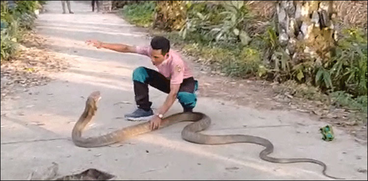 سوشل میڈیا پر وائرل ہونے والی ایک ویڈیو نے لوگوں کو خوفزدہ کردیا جس میں ایک شخص 14 فٹ طویل کنگ کوبرا پکڑنے کی کوشش کر رہا ہے۔