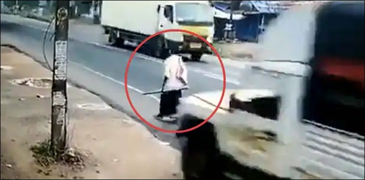 ویڈیو میں دیکھا جاسکتا ہے کہ ایک شخص بیگ اور چھڑی پکڑے سڑک پر چل رہا ہے اتنے میں ایک تیز رفتار گاڑی اس کے عقب سے گزرتی ہے اور خوش قسمتی اس کی زندگی بچ جاتی ہے۔