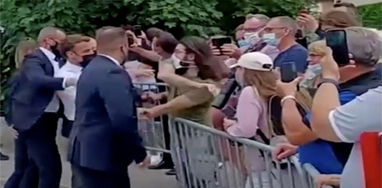جنوبی فرانس کے علاقے ڈروم پہنچنے پر فرانسیسی صدر بیریئر کے پیچھے موجود شہریوں سے ملاقات کر رہے تھے کہ اس دوران استقبال کے لیے موجود شہری نے ان کے چہرے پر تھپڑ دے مارا۔