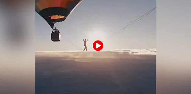 ویڈیو میں دیکھا جاسکتا ہے کہ ایک شخص دو پیراشوٹ کے درمیان بندھی رسی پر بنا کسی سہارے فضا میں چل رہا ہے۔