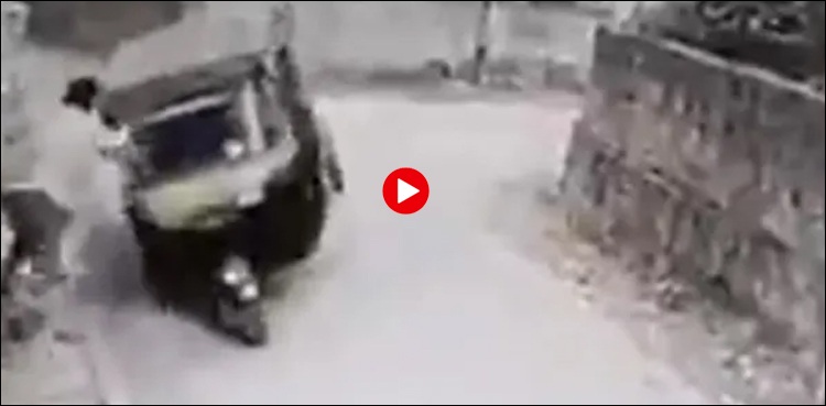 ویڈیو میں دیکھا جاسکتا ہے کہ ایک شخص گلی میں کنارے پر کھڑا ہے ایسے میں ایک تیز رفتار رکشہ موڑ لے کر گلی میں داخل ہوتا ہے تو سامنے کھڑا شخص اسے ہاتھ سے پیچھے ہٹانے کی کوشش کرتا ہے اتنے میں رکشہ ڈرائیور تیزی سے گزر جاتا ہے اور مذکورہ شخص حادثے سے بچ جاتا ہے۔