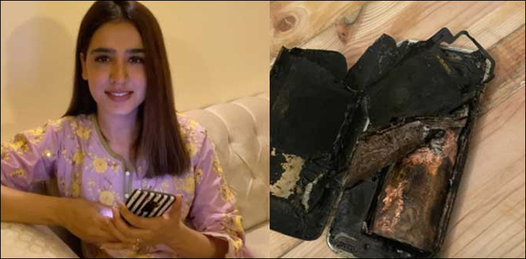 منشا پاشا نے اپنی انسٹاگرام اسٹوری میں فون کی کچھ تصاویر شیئر کیں جن میں دیکھا جاسکتا ہے کہ ان کا موبائل فون بری طرح سے جلا ہوا ہے۔