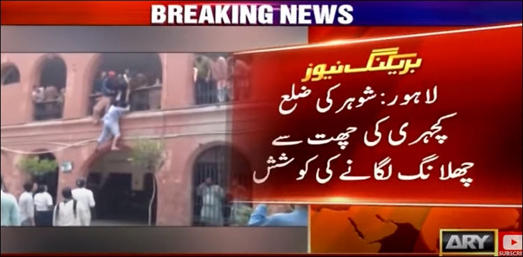 شوہر کی عدالت کی چھت سے کودنے کی کوشش احاطہ عدالت میں موجود لوگوں نے ناکام بنا دی، جس پر شوہر نے دہائیاں دیتے ہوئے کہا کہ بیوی سے پیار کرتا ہوں مگر وہ چھوڑ کر جارہی ہے۔
