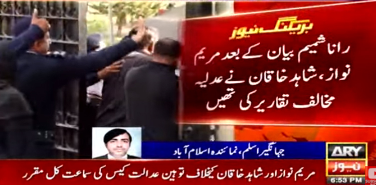 اے آر وائی نیوز کے مطابق گلگت بلتستان کے سابق چیف جج رانا شمیم کے بیان حلفی اور بیان کے بعد مریم نواز اور سابق وزیر اعظم شاہد خاقان عباسی نے عدلیہ مخالف تقاریر کیں۔