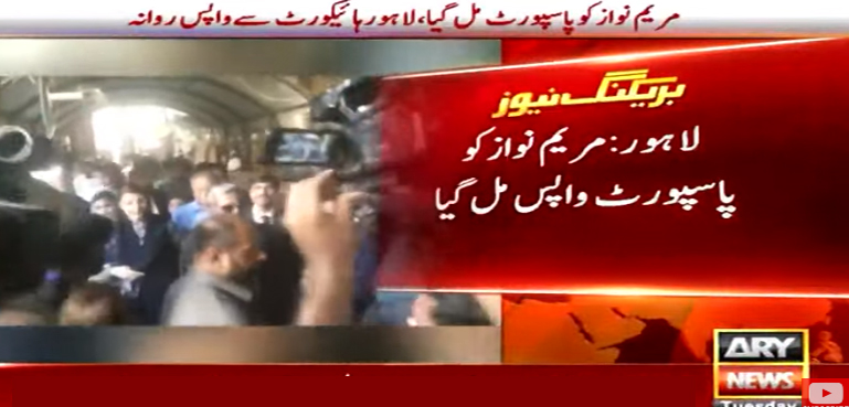 اے آر وائی نیوز کے مطابق پاکستان مسلم لیگ ن کی نائب صدر مریم نواز اپنا پاسپورٹ واپس لینے لاہور ہائیکورٹ  کے ڈپٹی رجسٹرار جوڈیشل کےآفس پہنچی تھیں، ان کے سینیئر رہنما پرویز رشید سمیت پارٹی کے دیگر رہنما بھی موجود تھے جب کہ سیکیورٹی کے خاص انتظامات کیے گئے تھے۔
