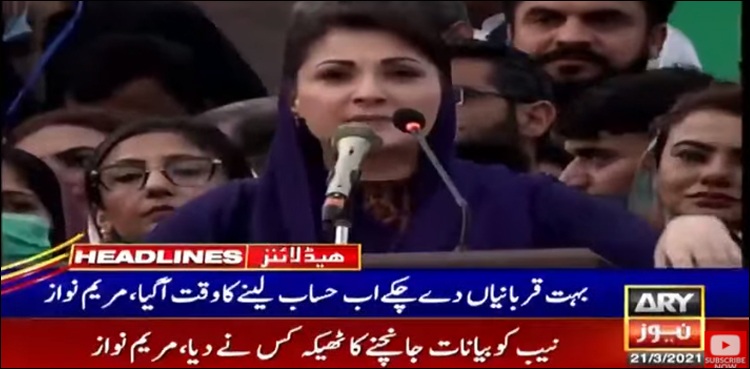 مریم نواز کا کہنا تھا کہ ’اتنی بری طرح ڈرے ہوئے ہیں کہ نیب کا 26مارچ کا نوٹس دے دیا، مریم نواز نیب آئےگی، فکرنہ کرو، جوتمہاری جان نکلی ہوئی تھی اسے واپس جانے نہیں دیں گے‘۔