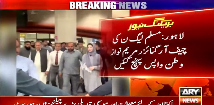 لاہور: پاکستان مسلم لیگ ن کی چیف آرگنائزر مریم نواز وطن واپس پہنچ گئیں۔