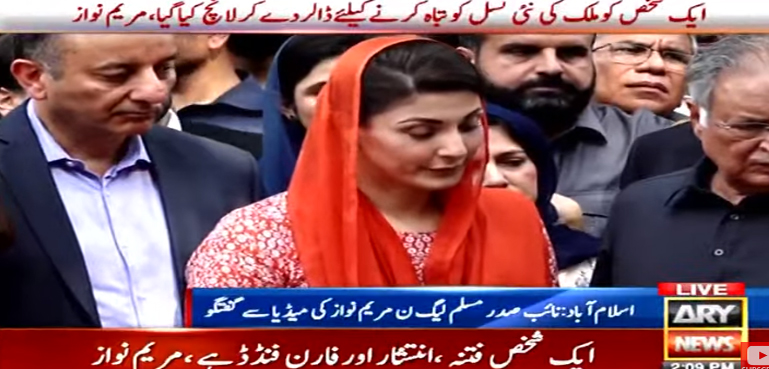 اے آر وائی نیوز کے مطابق مریم نواز نے اسلام آباد ہائیکورٹ میں ایون فیلڈ ریفرنس اپنی اور کیپٹن ریٹائرڈ صفدر کی جانب سے دائر اپیلوں کی سماعت کے بعد میڈیا سے گفتگو کرتے ہوئے کہا کہ ایک شخص فتنہ، انتشار اور فارن فنڈڈ ہے جس کو پاکستان کی نئی نسل کو تباہ کرنے کیلئے ڈالر دے کر لانچ کیا گیا اور وہ ملکی معیشت کی تباہی کے لیے لینڈ مائنز بچھا کر چلا گیا۔