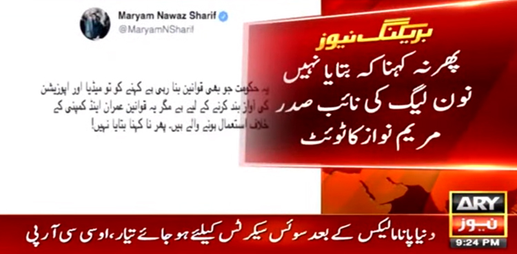 سماجی رابطے کی ویب سائٹ ٹوئٹر پر سابق وزیر اعظم نواز شریف کی صاحبزادی مریم نواز نے کہا کہ حکومت کے قوانین میڈیا اور اپوزیشن کی آواز  بند کرنے کے لیے ہیں، یہ قوانین عمران خان اینڈ کمپنی کے خلاف استعمال ہونے والے ہیں۔