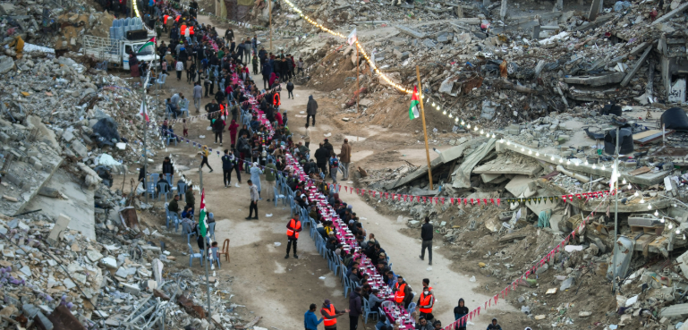 سوا سال سے مسلسل بارود برسنے کے نتیجے میں تباہ حال شہر غزہ میں مظلوم فلسطینیوں نے اپنا پہلا اجتماعی افطار ملبے کے درمیان کیا۔