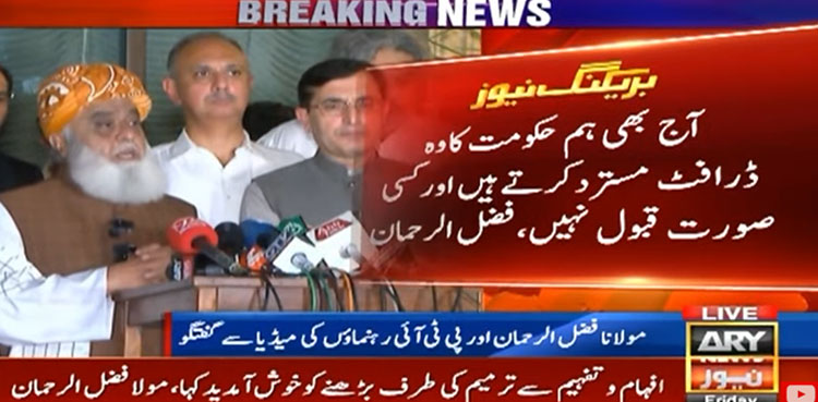 اے آر وائی نیوز کے مطابق مولانا فضل الرحمان نے میڈیا سے گفتگوکرتے ہوئے کہا کہ ہمارے ممبران کے اوپر دباؤ ڈالا جارہا ہے، پی ٹی آئی اور بی این پی ارکان کو دھمکایا جارہا ہے، ایسے ہتھکنڈے اپنائے جائیں گے تو پھرمجبور ہونگے کہ بات چیت روک دیں۔