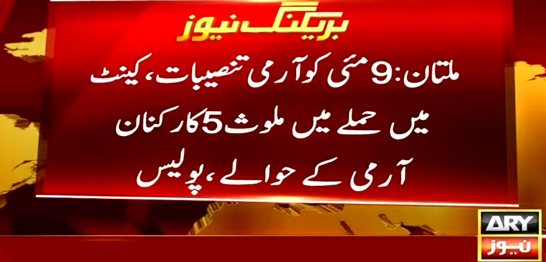 ملتان میں 9 مئی کو آرمی تنصیبات اور کینٹ ایریا میں حملے میں ملوث پانچ کارکنوں کو پولیس نے فوج کے حوالے کر دیا ہے۔
