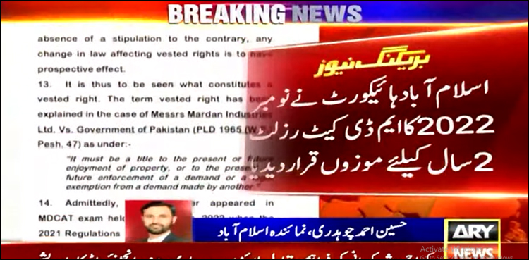 عدالت نے قرار دیا کہ 2021 کی ریگولیشنز کے مطابق نومبر 2022 کے ایم ڈی کیٹ نتائج 2 سال کے لیے موزوں ہیں، بعد میں کیے جانے والے ایڈمنسٹریٹو فیصلے سے پٹیشنر سے یہ حق واپس نہیں لیا جا سکتا، اس لیے پٹیشنر کا ایم ڈی کیٹ رزلٹ نومبر 2022 سے نومبر 2024 تک موزوں ہوگا۔