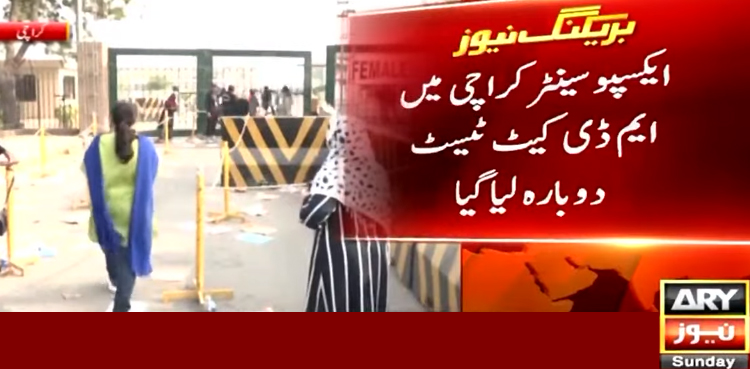 ایکسپو سینٹر کراچی میں ایم ڈی کیٹ ٹیسٹ کا دوبارہ انعقاد سخت سیکورٹی میں لیا گیا جس میں قریباً پندرہ ہزار طلبہ و طالبات شریک ہوئے۔