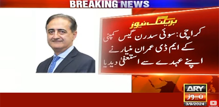 کراچی: سوئی سدرن گیس کمپنی کے ایم ڈی نے اپنے عہدے سے استعفی دے دیا۔