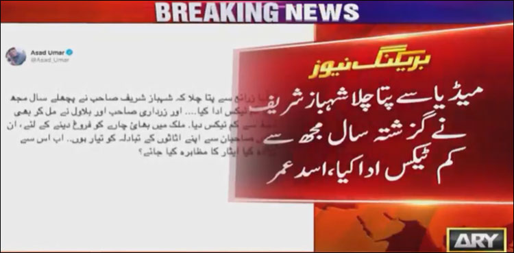 وفاقی وزیر منصوبہ بندی اسد عمر نے ان خیالات کا اظہار سماجی رابطے ویب سائٹ پر ٹوئٹ کے ذریعے کیا، اسد عمر نے اپنے بیان میں شہباز شریف پر طنز کرتے ہوئے کہا کہ مجھے میڈیا سے پتا چلا شہباز شریف نے گزشتہ سال مجھ سے کم ٹیکس ادا کیا۔