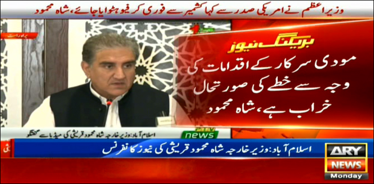 شاہ محمود کا کہنا تھا کہ آج ٹرمپ نے وزیر اعظم عمران خان سے فون پر رابطہ کیا، وزیر اعظم نے مقبوضہ کشمیر اور بھارتی جارحیت پر اپنا موقف بھرپور انداز سے پیش کیا، اور کہا کہ بھارت نے عالمی اداروں سے جو وعدے کیے وہ پورے کرے، مسئلے کا حل اقوام متحدہ کی قراردادوں کے مطابق تلاش کیا جائے۔