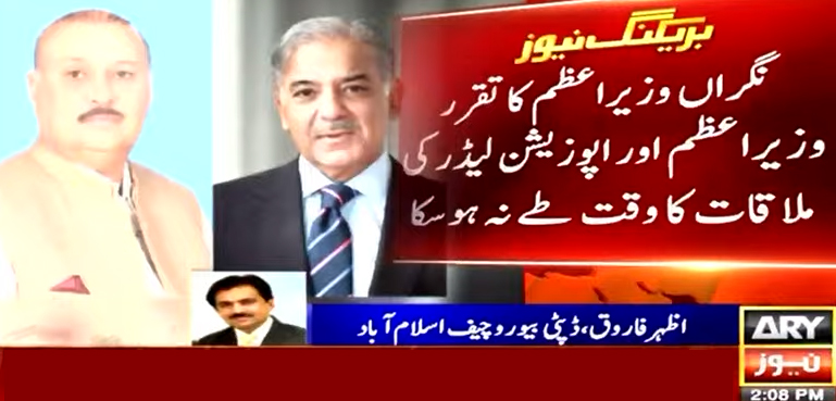 نگراں وزیراعظم کے تقریب کے لیے وزیراعظم شہباز شریف اور اپوزیشن لیڈر راجا ریاض کے درمیان آج ہونے والی ملاقات موخر کر دی گئی ہے۔