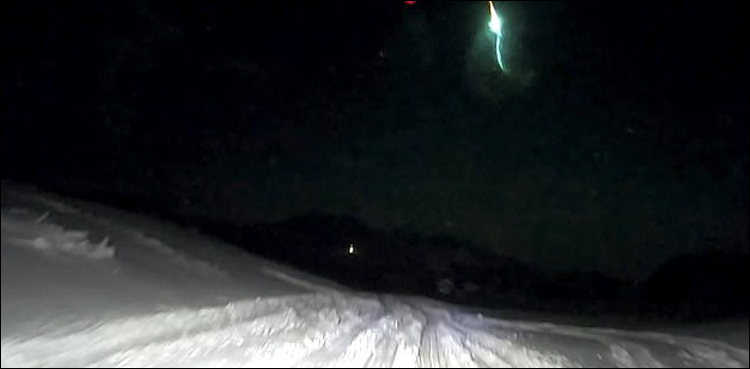 شہاب ثاقب زمین کے قریب آتے ہی پھٹ جاتا ہے اور سبز و نیلی روشنی آسمان پر پھیل جاتی ہے۔