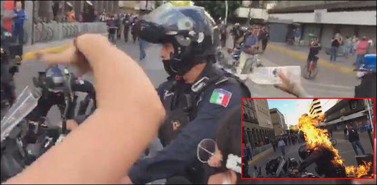 میکسیکو سٹی: فیس ماسک نہ پہننے پر پولیس کے ہاتھوں قتل ہونے والے شہری جیوانی لوپیز کی حمایت کے لیے نکلنے والے مظاہرین نے پولیس افسر کو آگ لگا دی۔