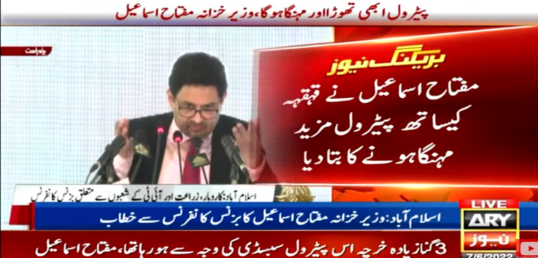 وزیر خزانہ مفتاح اسماعیل نے قہقہہ لگا کر ایک اور پٹرول بم گرانے کا اشارہ دے دیا اور کہا کہ پٹرول ابھی تھوڑا اور مہنگا ہوگا۔