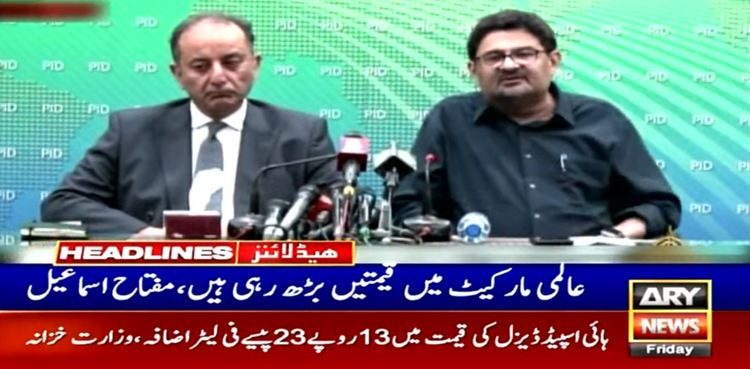 وزیر مملکت پیٹرولیم مصدق ملک کے ہمراہ پریس کانفرنس کرتے ہوئے وزیر خزانہ نے کہا کہ عالمی مارکیٹ میں پیٹرولیم مصنوعات کی قیمتوں میں اضافہ ہوا، پی ٹی آئی کے معاہدے کے مطابق پیٹرولیم مصنوعات پر 7 فیصد ٹیکس عائد ہونا تھا۔