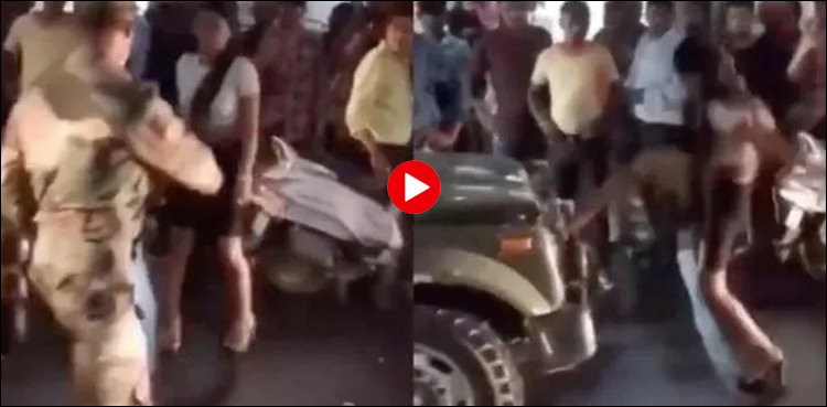 ویڈیو میں دیکھا جاسکتا ہے کہ لڑکی بار بار فوج کی گاڑی کو لاتیں مار رہی ہے، خاتون ماڈل نے گاڑی کی ہیڈ لائٹ کو نقصان پہنچایا اور فوجی اہلکار کو دھکے بھی دیتی رہی۔