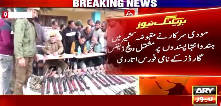 اے آر وائی نیوز کے مطابق مودی کی متعصب حکومت کے مسلم دشمنی اور مقبوضہ کشمیر میں مظلوم مسلمانوں پر مظالم میں اضافہ ہوگیا ہے اور اب مودی سرکار نے نیا اقدام کرتے ہوئے مقبوضہ کشمیر میں ہندو انتہا پسندوں پر مشتمل ویلج ڈیفنس گارڈز کے نام سے فورس اتار دی ہے جس کا مقصد کشمیریوں کی تحریک آزادی کو دبانا ہے۔