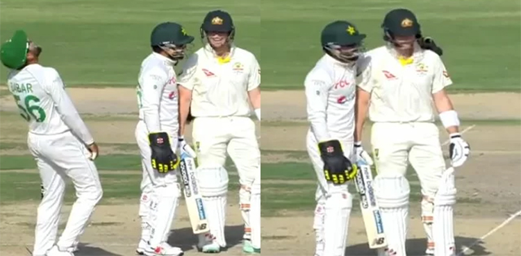 نیشنل اسٹیڈیم کراچی میں پاکستان کے وکٹ کیپر بلے باز محمد رضوان اور آسٹریلیا کے سینئر بلے باز اسٹیون اسمتھ نے ہوم سائیڈ اور مہمانوں کے درمیان جاری دوسرے ٹیسٹ میچ میں ایک ہلکا پھلکا لمحہ شیئر کیا۔