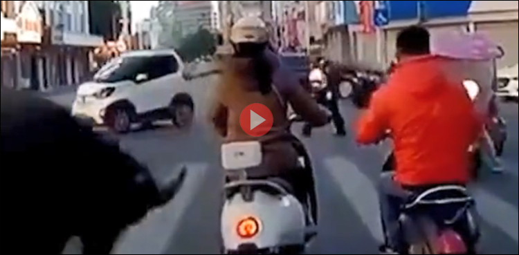 غصے سے بپھرے بیل نے پہلے سگنل پر موٹرسائیکل سوار خاتون کو ٹکر مار کر زخمی کیا، پھر دوڑتے ہوئے چار شہریوں کو زخمی کیا اور وہ اسٹور میں داخل ہوگیا، جہاں ملازمین نے اُسے بھگانے کی کوشش کی تو وہ چڑھ دوڑا۔