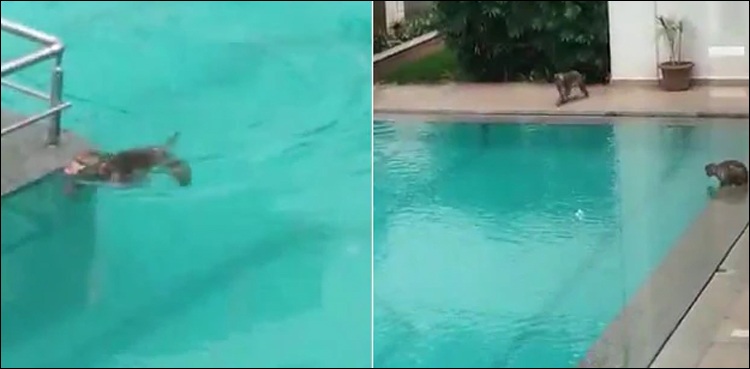 ایک بندر سے پانچ فٹ اوپر سے پانی میں چھلانگ لگائی اور وہ کمال مہارت سے تیرتا ہوا دوسری طرف چلا گیا۔ اسی طرح اُس کے دیگر ساتھی بھی مہارت کے ساتھ سوئمنگ پول میں تیرتے ہوئے نظر آئے۔
