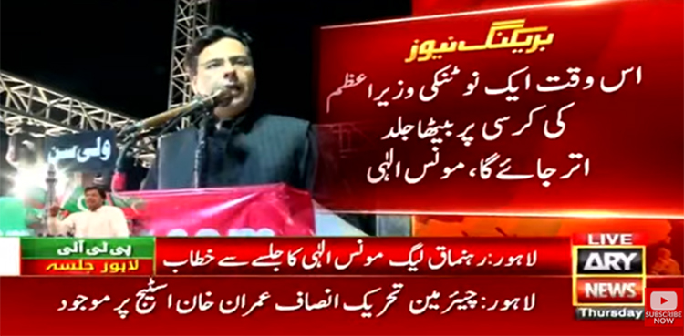 مینارِ پاکستان لاہور میں تحریک انصاف کے جلسہ عام سے خطاب کرتے ہوئے مونس الٰہی نے کہا کہ ایک نوٹنکی وزیراعظم عمران خان کی کرسی پر بیٹھا کچھ ہی عرصے بعد یہ نوٹنکی کرسی سے اترجائےگا۔