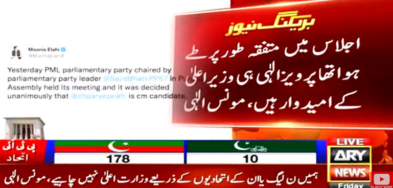 مونس الہٰی نے سماجی رابطوں کی ویب سائٹ ٹوئٹر پر ایک ٹوئٹ کیا ہے جس میں ان کا کہنا ہے کہ کل ق لیگ کی پارلیمانی پارٹی کا اجلاس ساجد بھٹی کی زیر صدارت ہوا تھا جس میں متفقہ طور پر طے ہوا تھا کہ پرویز الٰہی ہی وزیراعلیٰ کے امیدوار ہیں۔