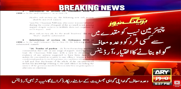 آرڈیننس کے تحت چیئر مین نیب کو مقدے میں سےکسی فرد کو وعدہ معاف گواہ بنانے کا اختیار مل گیا۔ وعدہ معاف گواہ اپنی گواہی مجسٹریٹ کے سامنے ریکارڈ کرائے گا۔