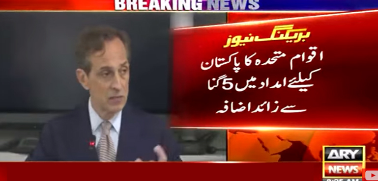 اے آر وائی نیوز کے مطابق اقوام متحدہ کے انسانی حقوق کے رابطہ کار جولین ہرنیس نے بتایا ہے کہ پاکستان کے لیے امداد کی اپیل 160 ملین ڈالر سے بڑھا کر 816 ملین ڈالر کردی گئی ہے۔