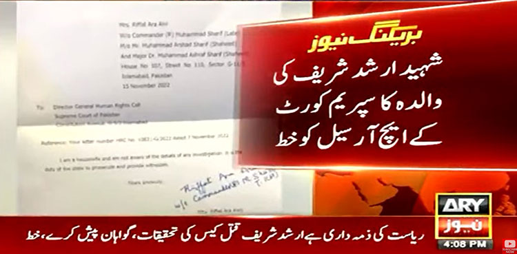 تفصیلات کے مطابق شہید ارشد شریف کی والدہ نے سپریم کورٹ کے ہیومن ریسورسز (ایچ آر) سیل کو خط لکھا ہے، جس میں انہوں نے اپنے بیٹے کے قتل کی تحقیقات سے لاعلمی کا اظہار کیا ہے۔