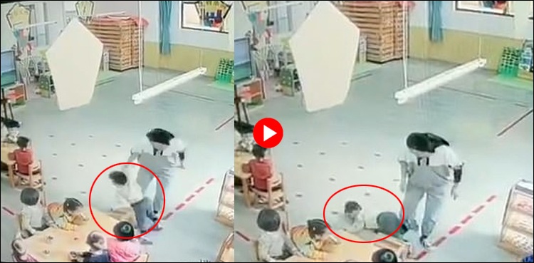 فوٹیج میں دیکھا جاسکتا ہے کہ کلاس میں کمسن بچہ اپنی کرسی کو زمین پر رکھ کر کھیل رہا تھا کہ اسی دوران ٹیچر تیز قدموں سے چلتی ہوئی آئی اور اُسے اٹھا کر زور سے زمین پر پھینک دیا۔