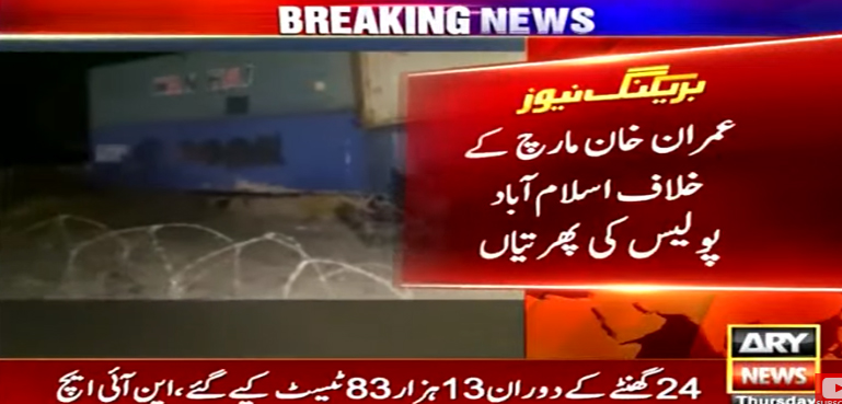 اے آر وائی نیوز کے مطابق حقیقی آزادی مارچ ابھی دارالحکومت سے کافی دور ہے لیکن اسلام آباد پولیس نے توسیع شدہ ریڈ زون کے باہر مسلح اہلکار تعینات کرنے کے لیے منظوری مانگ لی ہے۔
