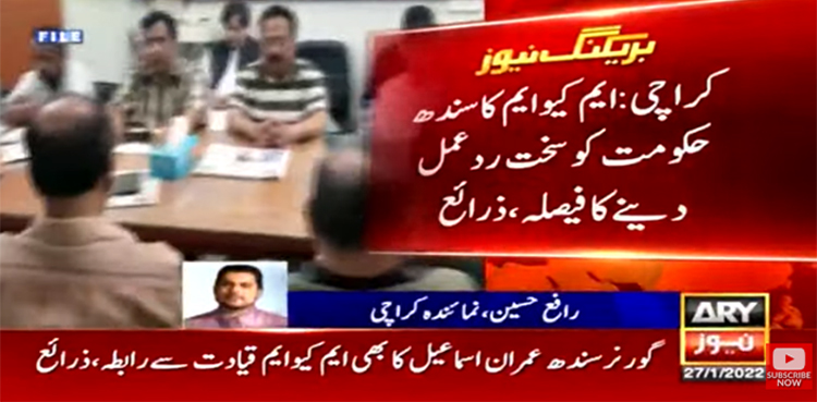 نمائندہ اے آر وائی نیوز نے اپنے ذرائع کے حوالے سے بتایا کہ ایم کیو ایم رابطہ کمیٹی کا بہادر آباد مرکز پر ہنگامی اجلاس ہوا جس کی صدارت کنونئیر ایم کیو ایم ڈاکٹر خالد مقبول صدیقی نے کی۔