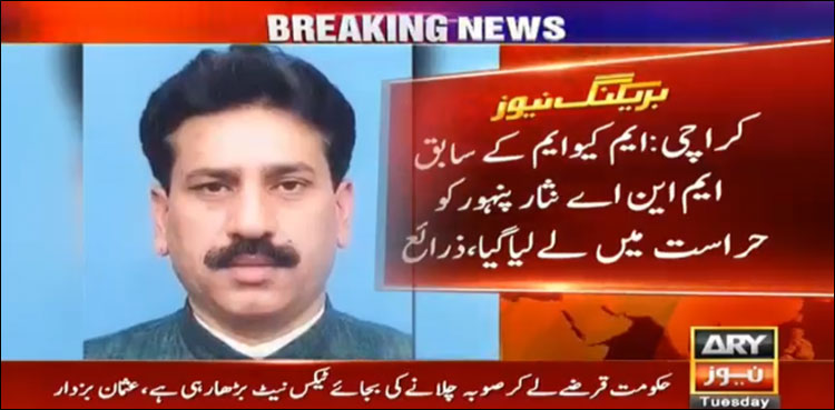 کراچی : ایم کیوایم کے سابق ایم این اے نثار پنہور کو گرفتار کرلیا گیا ، بیٹے کا کہنا ہے کہ رات سے والد صاحب سے رابطہ نہیں ہورہا، میرے والد پرویز مشرف دور میں ایم این اے تھے۔