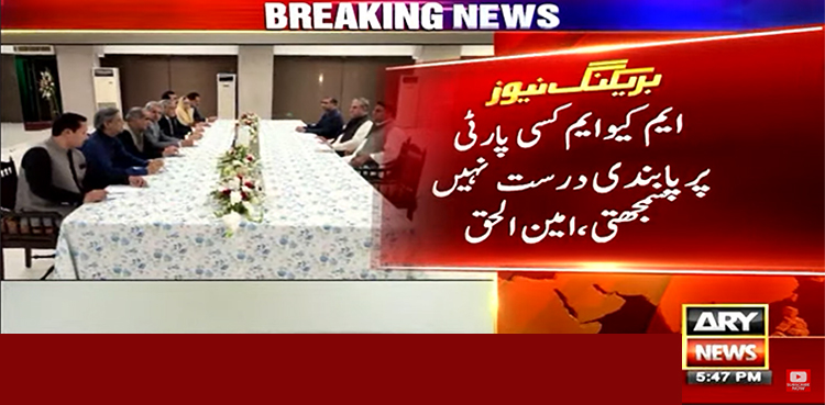وفاقی وزیر برائے انفارمیشن ٹیکنالوجی امین الحق نے کہا ہے کہ ایم کیوایم کسی پارٹی پر پابندی درست نہیں سمجھتی۔
