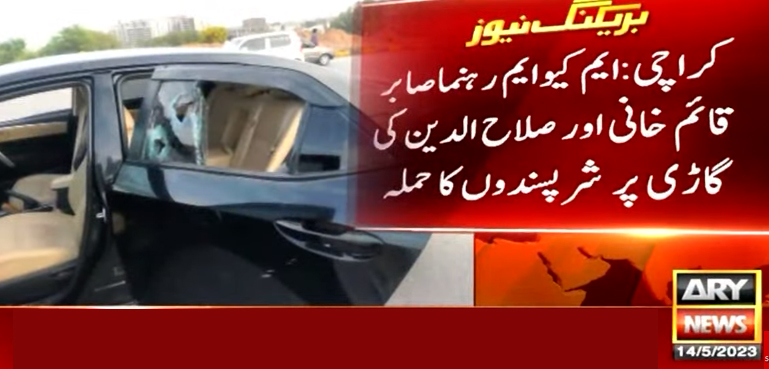 متحدہ قومی موومنٹ کے اراکین قومی اسمبلی صابر قائمخانی اور صلاح الدین کی گاڑی پر شرپسندوں نے حملہ کیا جس سے گاڑی کو شدید نقصان پہنچا ہے۔