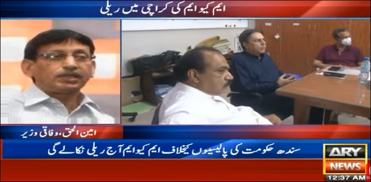 اے آر وائی نیوز سے گفتگو کرتے ہوئے وفاقی وزیر برائے انفارمیشن ٹیکنالوجی امین الحق نے کہا کراچی میں پانی کی قلت ہے، شہر میں جعلی ڈومیسائل پر بھرتیاں کی جارہی ہیں، نوجوانوں سے اُن کا جائز روزگار چھینا جارہا ہے۔ انہوں نے کہا کہ اگر سندھ حکومت نے اپنی پالیسیاں اور روش تبدیل نہ کی تو ہم عوام کے ساتھ وزیراعلیٰ ہاؤس تک جائیں گے۔