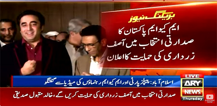 ایم کیوایم پاکستان نے صدارتی انتخاب میں آصف زرداری کی حمایت کا اعلان کر دیا۔