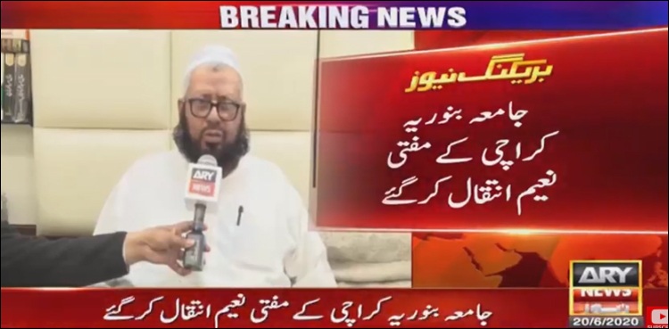اے آر وائی نیوز کی رپورٹ کے مطابق جامعہ بنوریہ کراچی کے مفتی نعیم کراچی میں انتقال کرگئے، مفتی نعیم دل کے عارضے میں مبتلا تھے۔