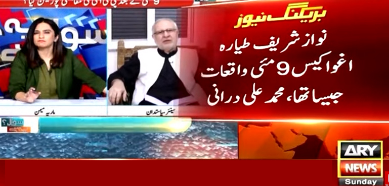 سابق وفاقی وزیر محمد علی درانی نے اے آر وائی نیوز کے پروگرام سوال یہ ہے میں گفتگو کرتے ہوئے کہا کہ نواز شریف کے خلاف طیارہ سازش کیس 9 مئی واقعات جیسا تھا، طیارہ غوا کر کے بھارت میں اتارنے کی بات ہو رہی تھی۔