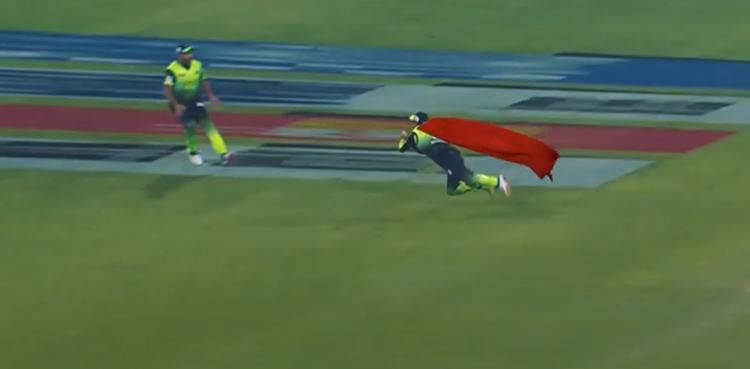 پشاور زلمی کے خلاف میچ کے دوران عمران طاہر کے ہاتھوں میں آیا، کیچ محمد رضوان نے بھاگتے ہوئے پکڑ لیا اور اس غیرمتوقع صورتحال پر فیلڈر ہکا بکا رہ گئے۔