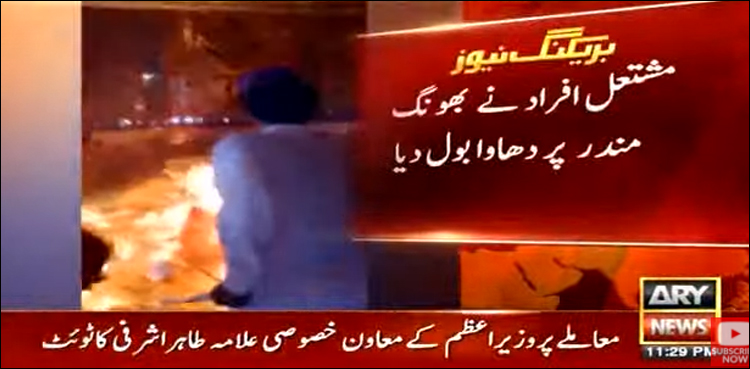 اے آر وائی نیوز کے مطابق پنجاب کے علاقے صادق آباد کے نواحی شہر بھونگ میں دو گروپوں کے درمیان ہونے والا جھگڑا مذہبی رنگ اختیار کرگیا، جس کے بعد مشتعل افراد نے علاقے میں قائم قدیم مندر پر حملہ کیا اور اُسے نذر آتش کردیا۔
