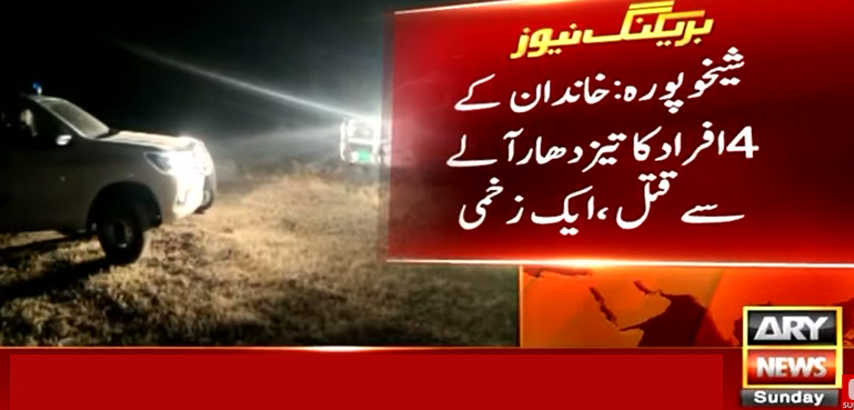 اے آر وائی نیوز کے مطابق قتل کی یہ لرزہ خیز واردات شیخوپورہ کے تھانہ صدر کی حدود میں ہوئی ہے جس میں ایک ہی خاندان کے چار افراد کو بہیمانہ طریقے سے قتل کر دیا گیا ہے جب کہ ایک شخص زخمی بھی ہوا ہے۔